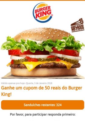 Um novo golpe que se espalha pelo WhatsApp promete um cupom de R$ 50 de descontos para o Burger King. [Leia mais...]
