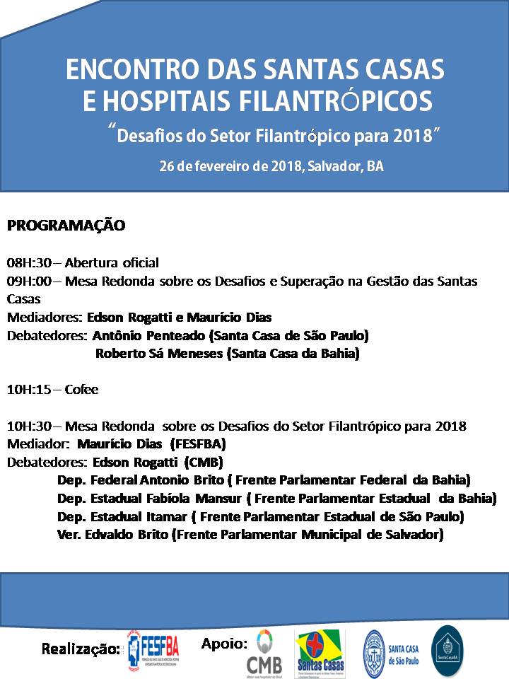 Para debater os "Desafios do Setor Filantrópico para 2018", Salvador sedia na próxima segunda-feira (26) o encontro das Santas Casas e hospitais filantrópicos [Leia mais...]