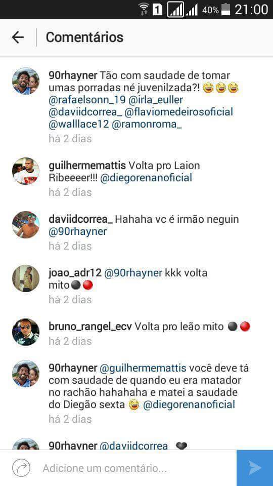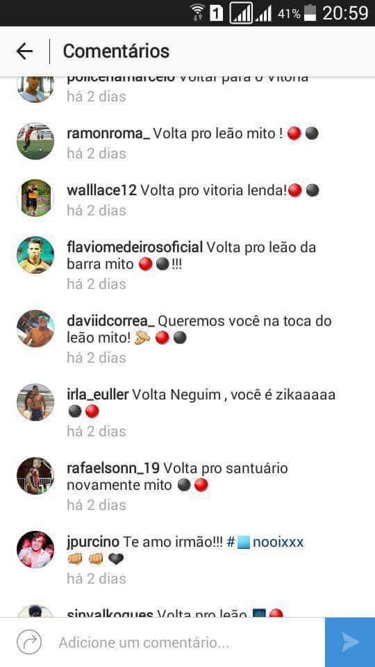 "Queremos você na Toca do Leão, mito!", escreveu um deles. Rhayner foi destaque do Leão em 2015 e acabou contratado pela Ponte Preta após o fim da Série B. Com a camisa do time baiano, foram 42 jogos pelo campeonato e oito gols marcados.