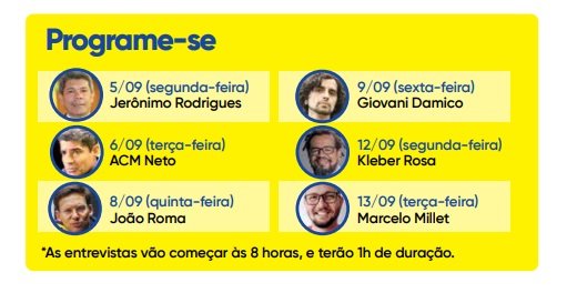 Para o candidato do PT, Jerônimo Rodrigues, a entrevista será uma oportunidade para mostrar o trabalho realizado pelo seu grupo político. “Estamos na expectativa de, mais uma vez, apresentar nossas propostas e discutir temas de interesse dos baianos e baianas. Voltaremos a destacar o trabalho do time de Lula na Bahia, iniciado por Wagner e acelerado por Rui Costa”, afirma o petista.