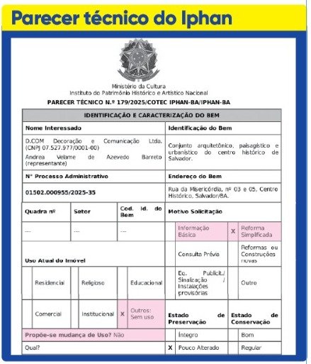 No trecho do parecer onde estão descritas a identificação e a caracterização, há dois tópicos que requerem maior atenção do leitor e podem ser vistos na reprodução do documento que ilustra esta página. No primeiro, a requerente, ou seja, a idealizadora do rooftop onde está instalado o novo restaurante de alto padrão do Grupo Origem, informa que os prédios históricos que integram o Casario da Misericórdia estavam sem uso na data da solicitação ao Iphan. No segundo, Andrea Velame é instada a responder se existe proposta de mudança do uso dos imóveis, e ela afirma que não. A realidade, contudo, prova o contrário.